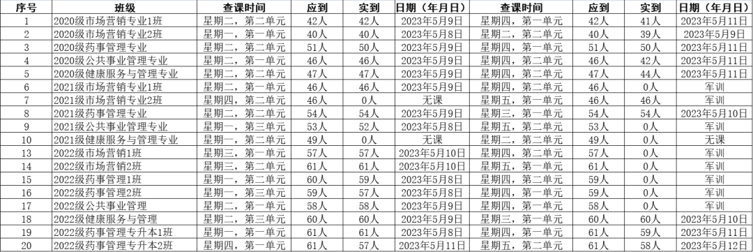 2020级药事管理专业出勤率98.03%;
