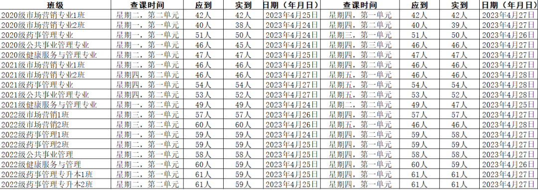 2020级药事管理专业出勤率98.04%;