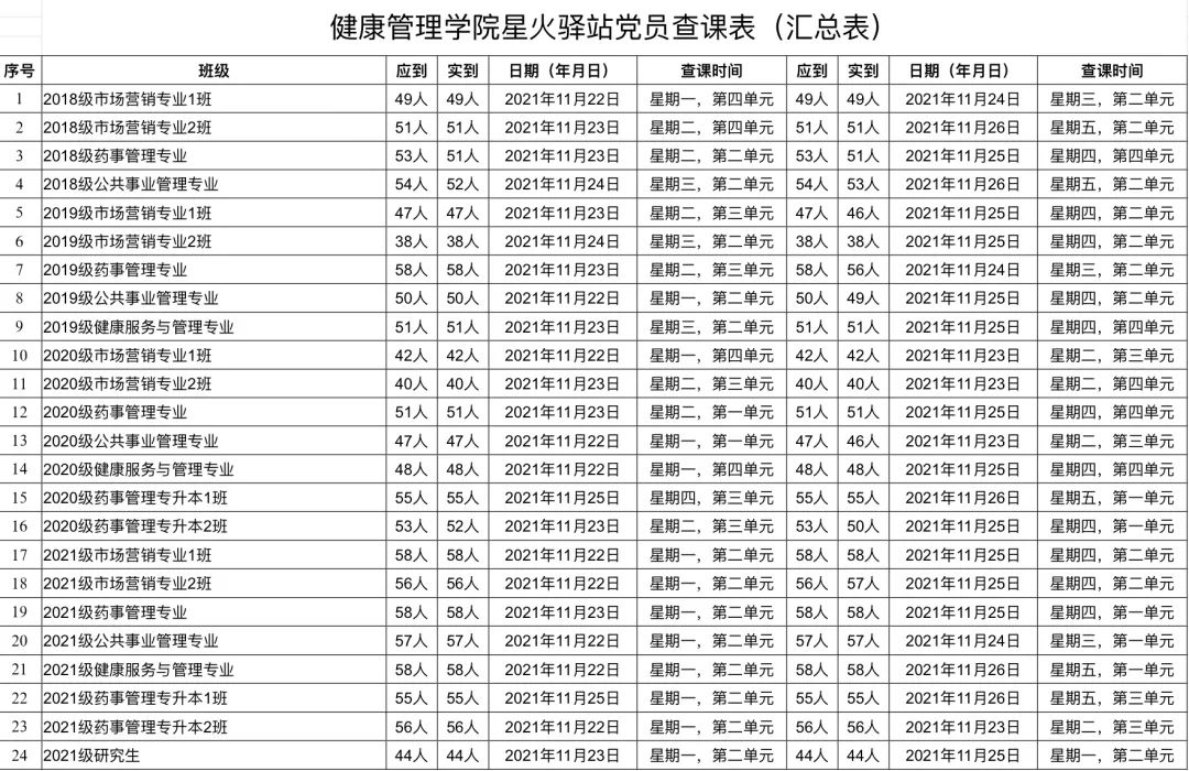 出勤率较好的班级有:2018级市场营销专业1班(出勤率100%)、2018级市场营销专业2班(出勤率100%)、2019级市场营销专业2班(出勤率100%)、2019级健康服务与管理专业(出勤率100%)、2020级市场营销专业1班(出勤率100%)、2020级市场营销专业2班(出勤率100%)、2020级药事管理专业(出勤率100%)、2020级药事管理专升本1班(出勤率100%)、2020级药事管理专升本2班(出勤率100%)、2021级市场营销专业1班(出勤率100%)、2021级药事管理专业(出勤率100%)、2021级公共事业管理专业(出勤率100%)、2021级健康服务与管理专业(出勤率100%)、2021级药事管理专升本1班(出勤率100%)、2021级药事管理专升本2班(出勤率100%)、2021级研究生(出勤率100%)。