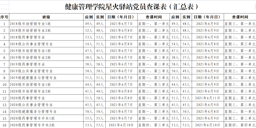 出勤情况较好的班级有:2018级药事管理专业(出勤率100%)、2019级药事管理专业(出勤率100%)、2020级公共事业管理专业(出勤率100%)、2020级健康服务与管理专业(出勤率100%)、2020级药事管理专升本1班(出勤率100%)、2020级药事管理专升本2班(出勤率100%)