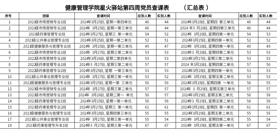 为加强学院学风建设,规范课堂秩序,营造良好的学习氛围,Beat365唯一官方网站党委积极组织学生党员开展查课工作,于3月31日,对第四周的查课情况做出总结。本周查课以严谨认真的态度对迟到、旷课、带早餐的学生进行了督促和提醒。学生党员进入每间教室内检查学生出勤情况。经过一周的督查,学院共查18个班级36节课,覆盖学院全体21级、22级、23级以及23级专升本共982名学生。现查课通报如下: