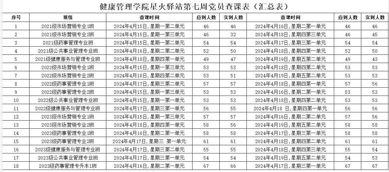 为加强学院学风建设,规范课堂秩序,营造良好的学习氛围,Beat365唯一官方网站党委积极组织学生党员开展查课工作,于4月21日,对第七周的查课情况做出总结。本周查课以严谨认真的态度对迟到、旷课、带早餐的学生进行了督促和提醒。学生党员进入每间教室内检查学生出勤情况。经过一周的督查,学院共查18个班级36节课,覆盖学院全体21级、22级、23级以及23级专升本共982名学生。现查课通报如下: