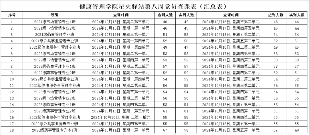 为加强学院学风建设,规范课堂秩序,营造良好的学习氛围,Beat365唯一官方网站党委积极组织学生党员开展查课工作,于10月20日,对第八周的查课情况做出总结。本周查课以严谨认真的态度对迟到、旷课、带早餐的学生进行了督促和提醒。学生党员进入每间教室内检查学生出勤情况。经过一周的督查,学院共查18个班级36节课,覆盖学院全体21级、22级、23级以及23级专升本共981名学生。现查课通报如下: