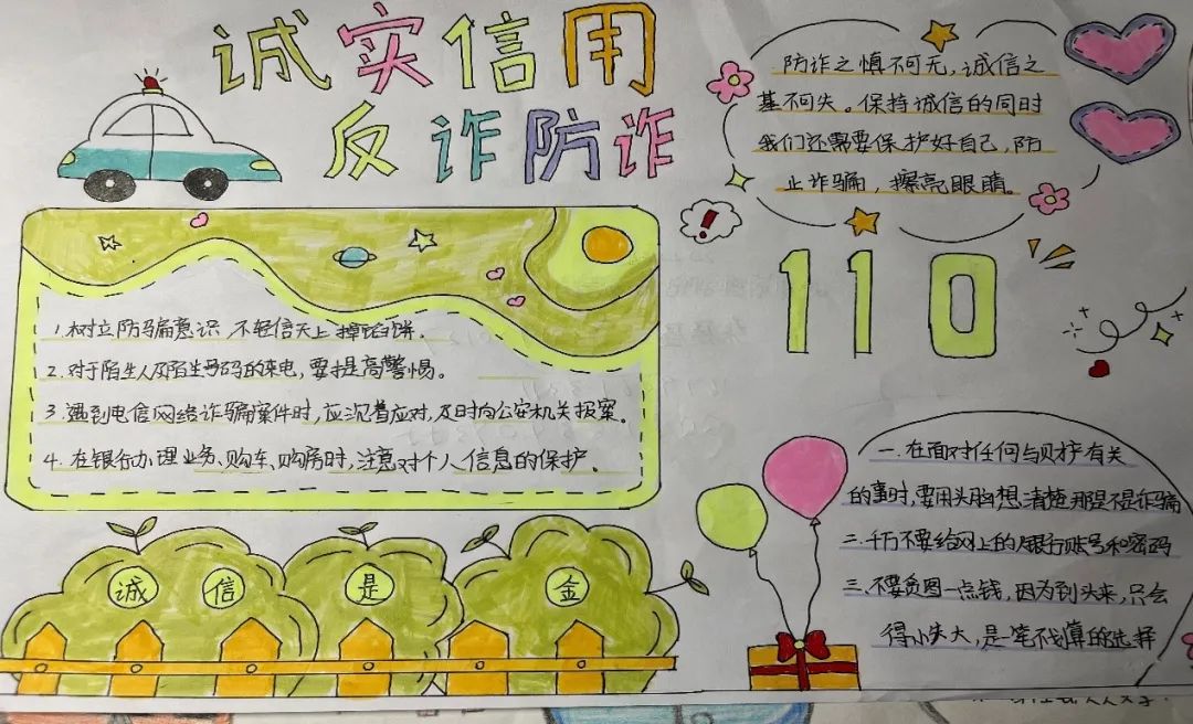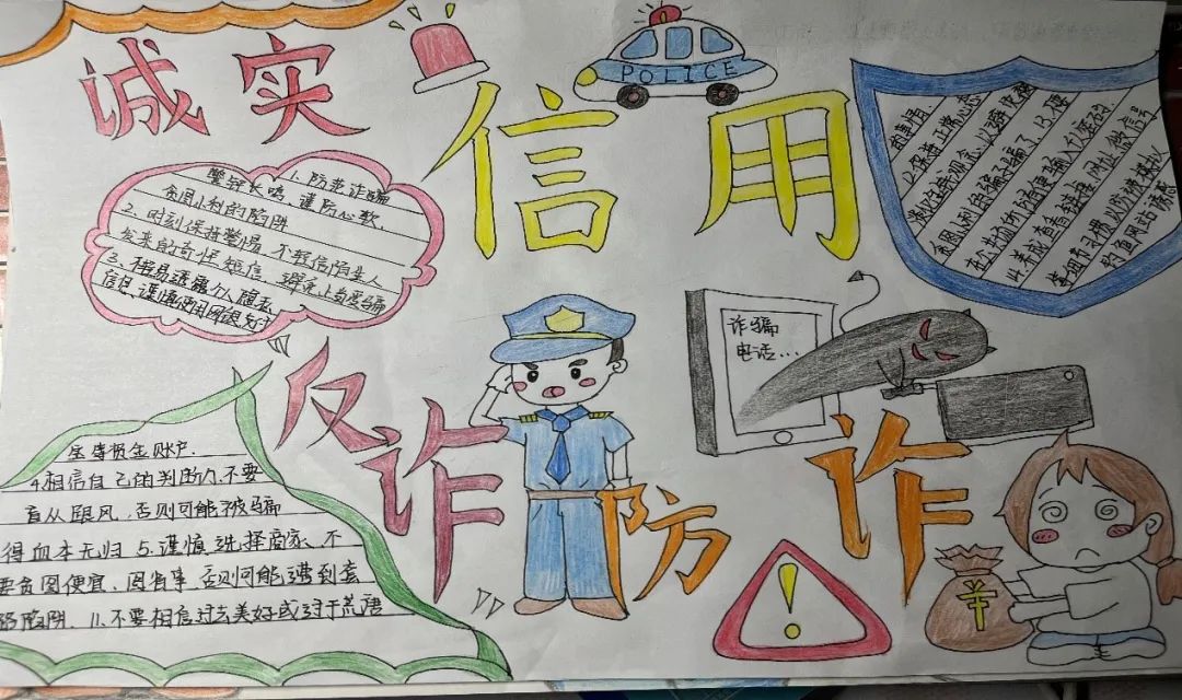 小心“防”诈骗,安全“0”距离。通过这次手抄报活动,部分同学表示:“只要我们谨慎行事,捂紧口袋,正确判断,就能远离诈骗。”本次“诚实信用,反诈防诈”手抄报活动的开展,有效促进反诈工作纵深推进。在校内营造起抵御风险的健康氛围,有效保障学校安定祥和与大学生合法权益。